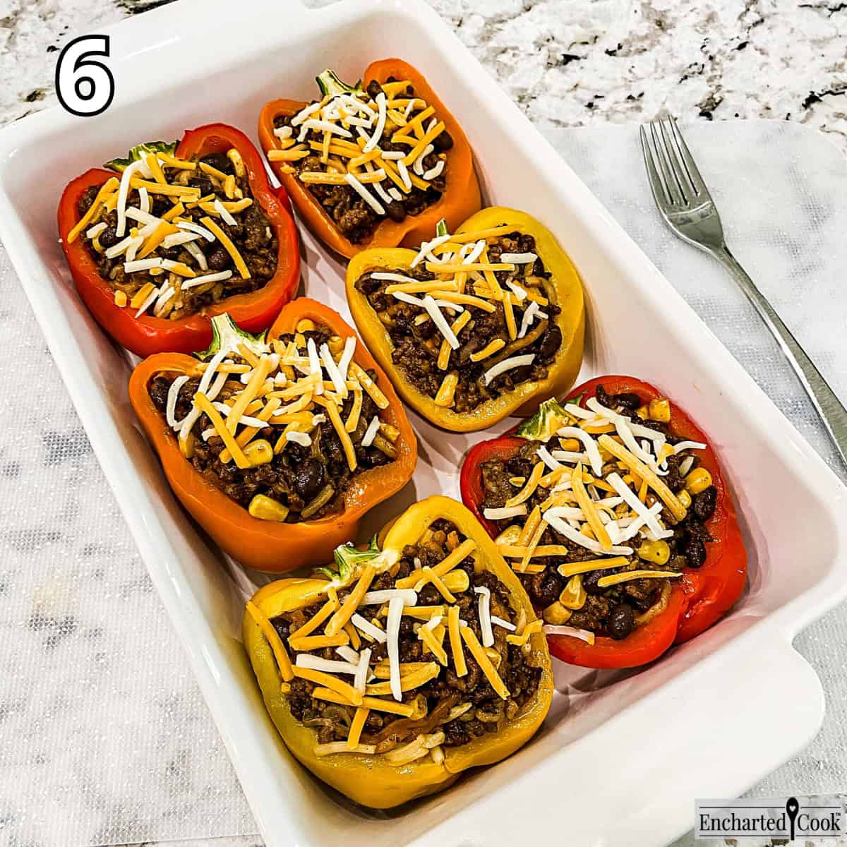 - Step 5: Fill the Peppers. Fill the bell pepper halves with the taco meat mixture and sprinkle the filled peppers with the remaining 1 cup of shredded cheese.